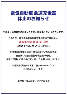このたび、電気自動車の急速充電器交換工事に伴い、2025年10月10日(金)よりご利用を休止させていただきます。